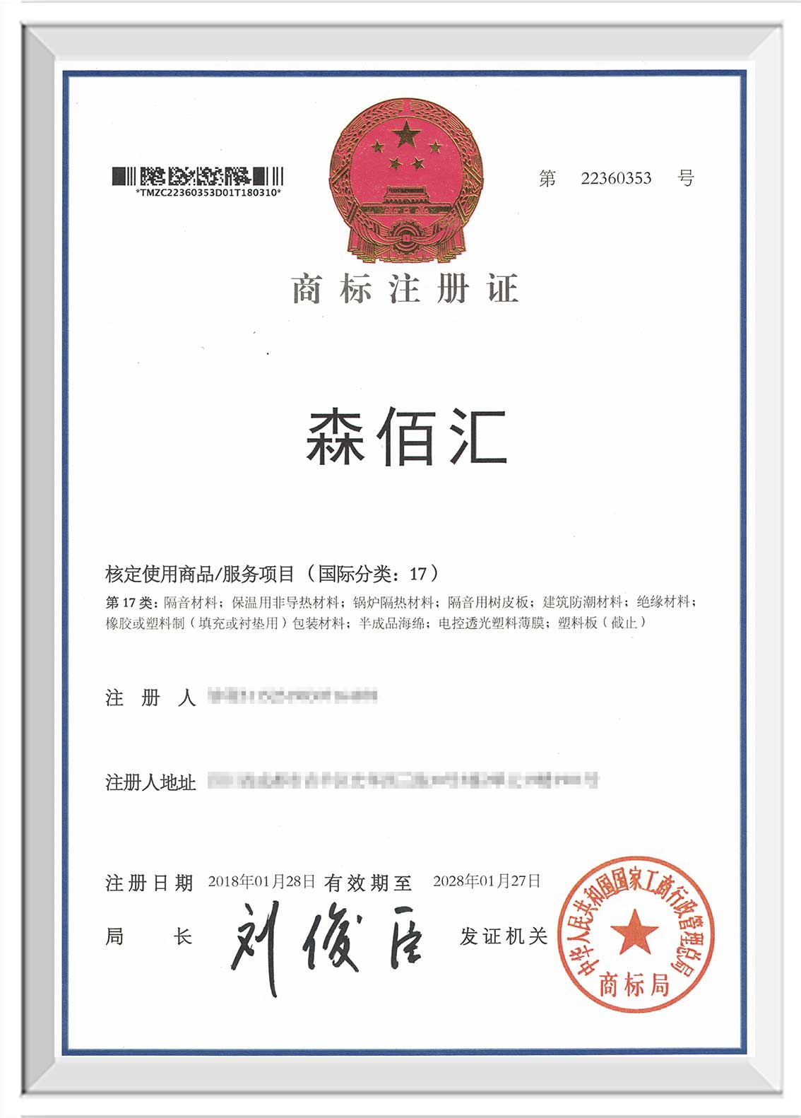 淮安“森佰汇”商标证书下发至企业